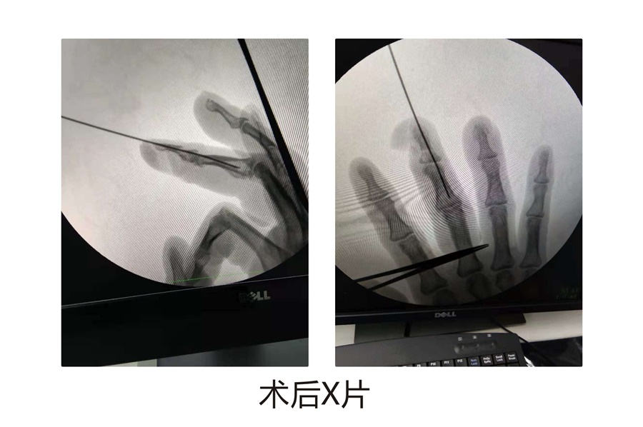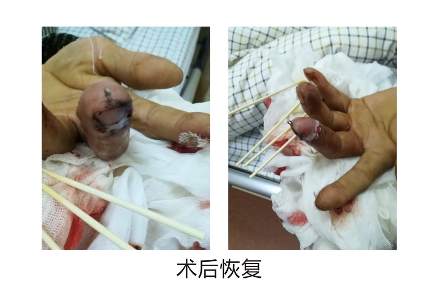 该患者中指呈重度绞榨后离断,桡侧指‘’A‘’、指“N”侧附肌腱、伸、屈指肌腱、手指皮肤呈环状断裂,末节指骨完全断裂并向尺侧移位,仅残留桡侧皮肤约0.4cm。在席全松主任医师的指导下由王江平医生主刀、邹镇东等积极配合协助,于晚上7时手朮顺利结束,成功地将断裂的残指先后行骨折内固定后再 行“N”、“A”肌腱修复。