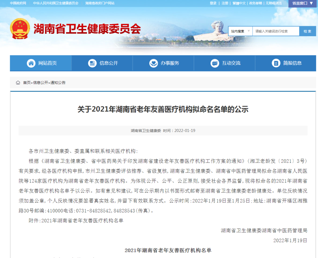 老年友善医疗机构创建工作是“全面推进健康中国建设,积极应对人口老龄化国家战略”的一项具体举措。为切实满足老年人的健康服务需求,为老年人营造尊重、关爱的就医环境,我院从环境、管理、服务、文化等方面全力开展老年友善医疗机构创建工作。2022年3月1日~10日,湖南经视对衡阳世和医院“老年友善医疗机构”进行展播。,时长00:......【详细】